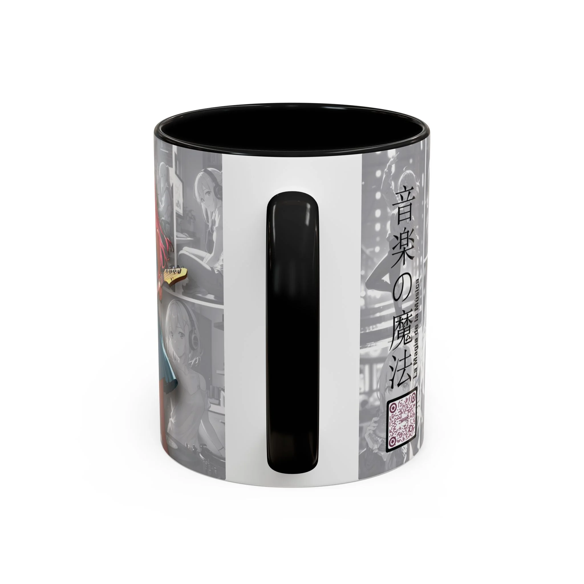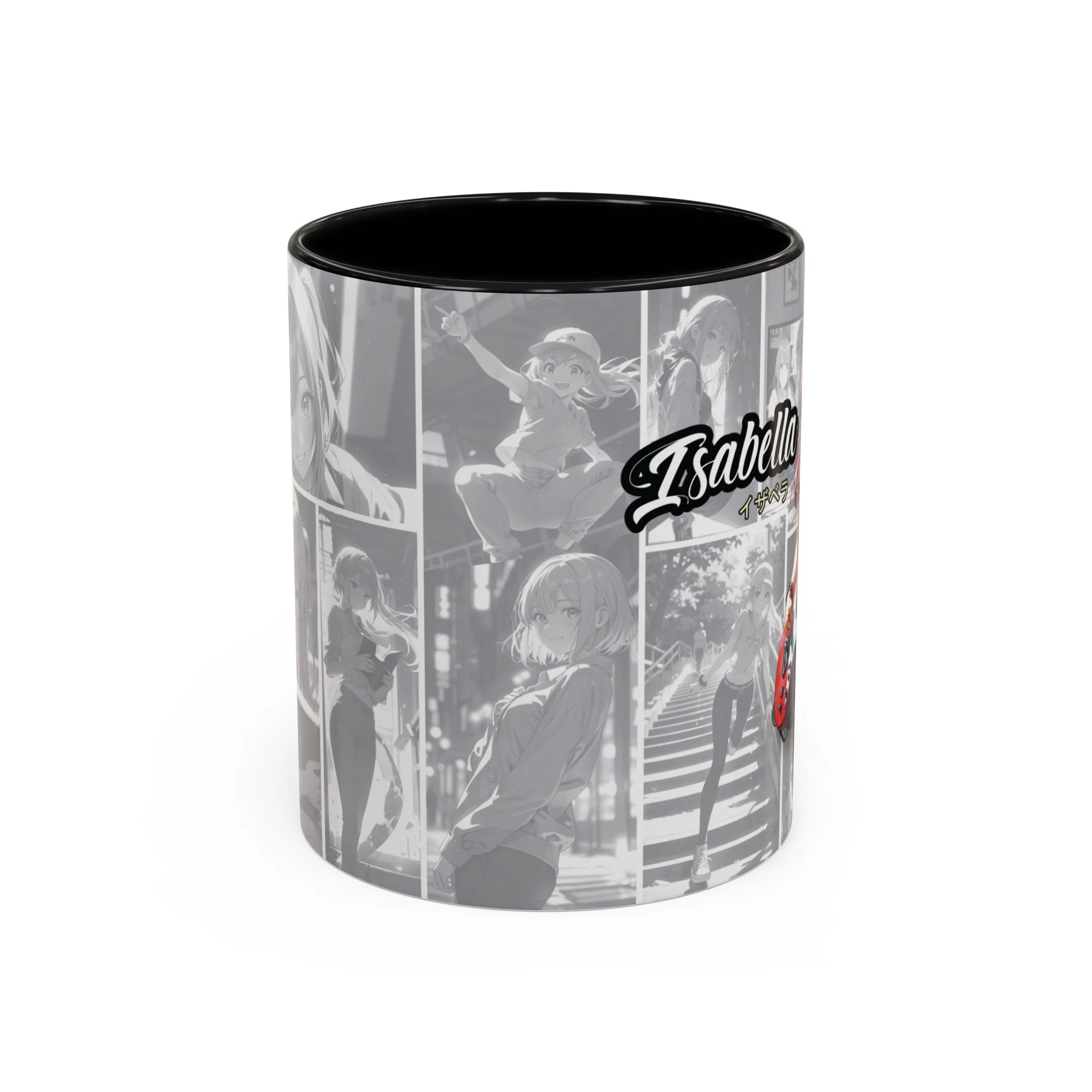 Esta taza es una pieza imprescindible para cualquier fan del anime y la música. Presenta a Isabella en un vibrante primer plano, tocando su guitarra eléctrica roja sobre un cautivador fondo de collage en escala de grises. Este diseño no solo es elegante, sino que también evoca una sensación de nostalgia y un look de álbum de recortes musical que destaca en cualquier colección.